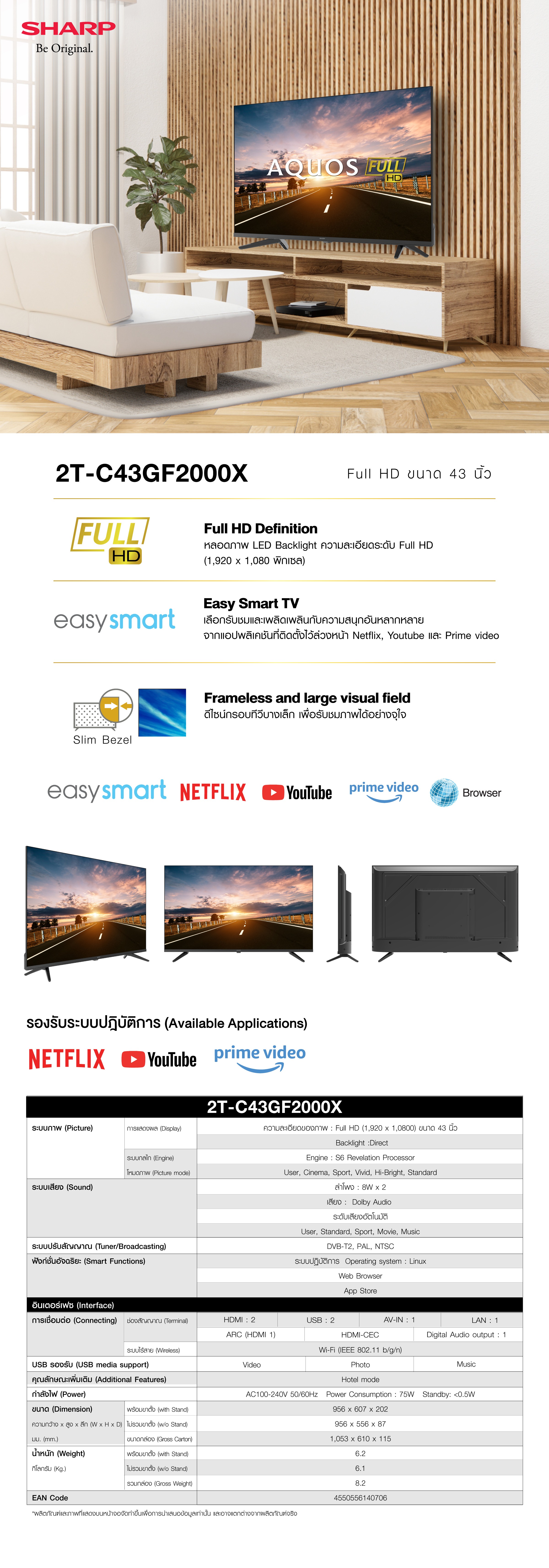 Easy Smart Full HD TV ทีวี 43 นิ้ว SHARP รุ่น 2T-C43GF2000X (รับประกันศูนย์ 1 ปี)