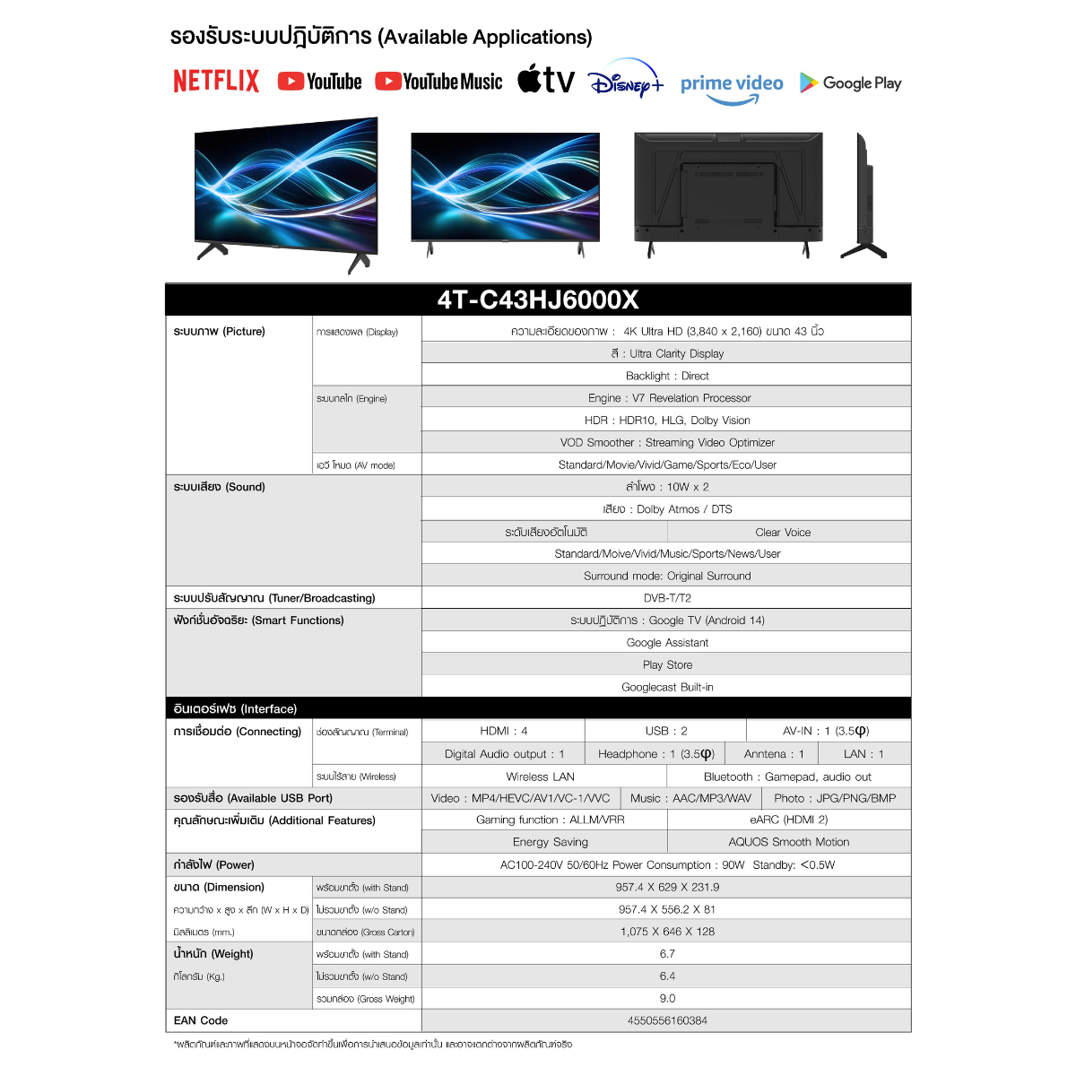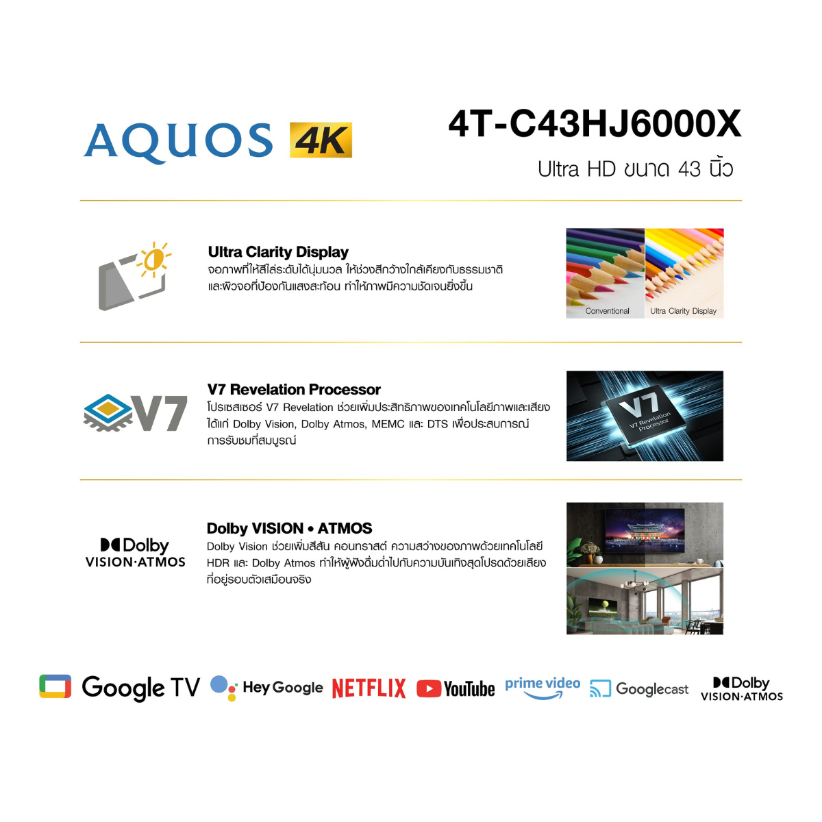 4T-C43HJ6000X เป็น Google TV ที่มาพร้อมความละเอียด 4K Ultra HD เพื่อภาพที่คมชัดและสีสันสมจริงด้วย Ultra Clarity Display, รองรับ Dolby Vision และ Dolby Atmos เพื่อประสบการณ์ภาพและเสียงที่เหนือกว่า, มีโหมดถนอมสายตา (Eye Protection Mode) และ Anti Glare เพื่อความสบายในการรับชม, รวมถึงโหมด Gaming (ALLM/VRR) สำหรับคอเกม และคุณสมบัติป้องกัน 7 ประการเพื่อความทนทาน.