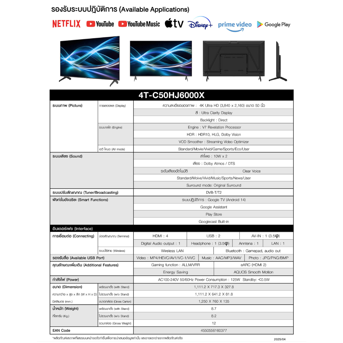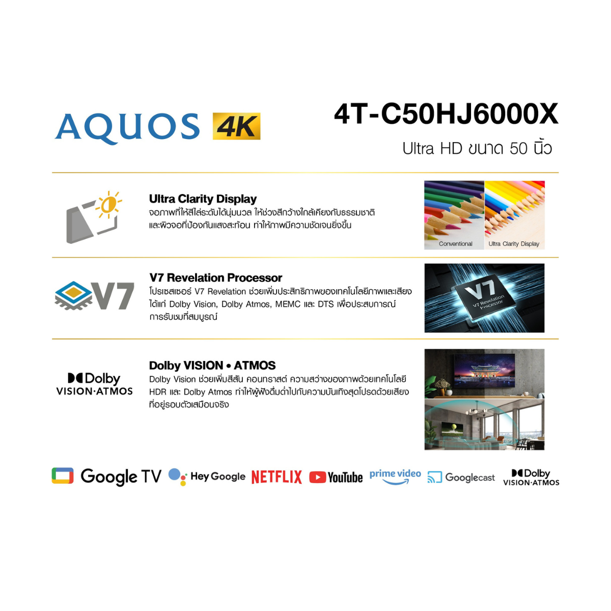 4T-C50HJ6000X เป็น Google TV ที่มาพร้อมความละเอียด 4K Ultra HD เพื่อภาพที่คมชัดและสีสันสมจริงด้วย Ultra Clarity Display, รองรับ Dolby Vision และ Dolby Atmos เพื่อประสบการณ์ภาพและเสียงที่เหนือกว่า, มีโหมดถนอมสายตา (Eye Protection Mode) และ Anti Glare เพื่อความสบายในการรับชม, รวมถึงโหมด Gaming (ALLM/VRR) สำหรับคอเกม และคุณสมบัติป้องกัน 7 ประการเพื่อความทนทาน.