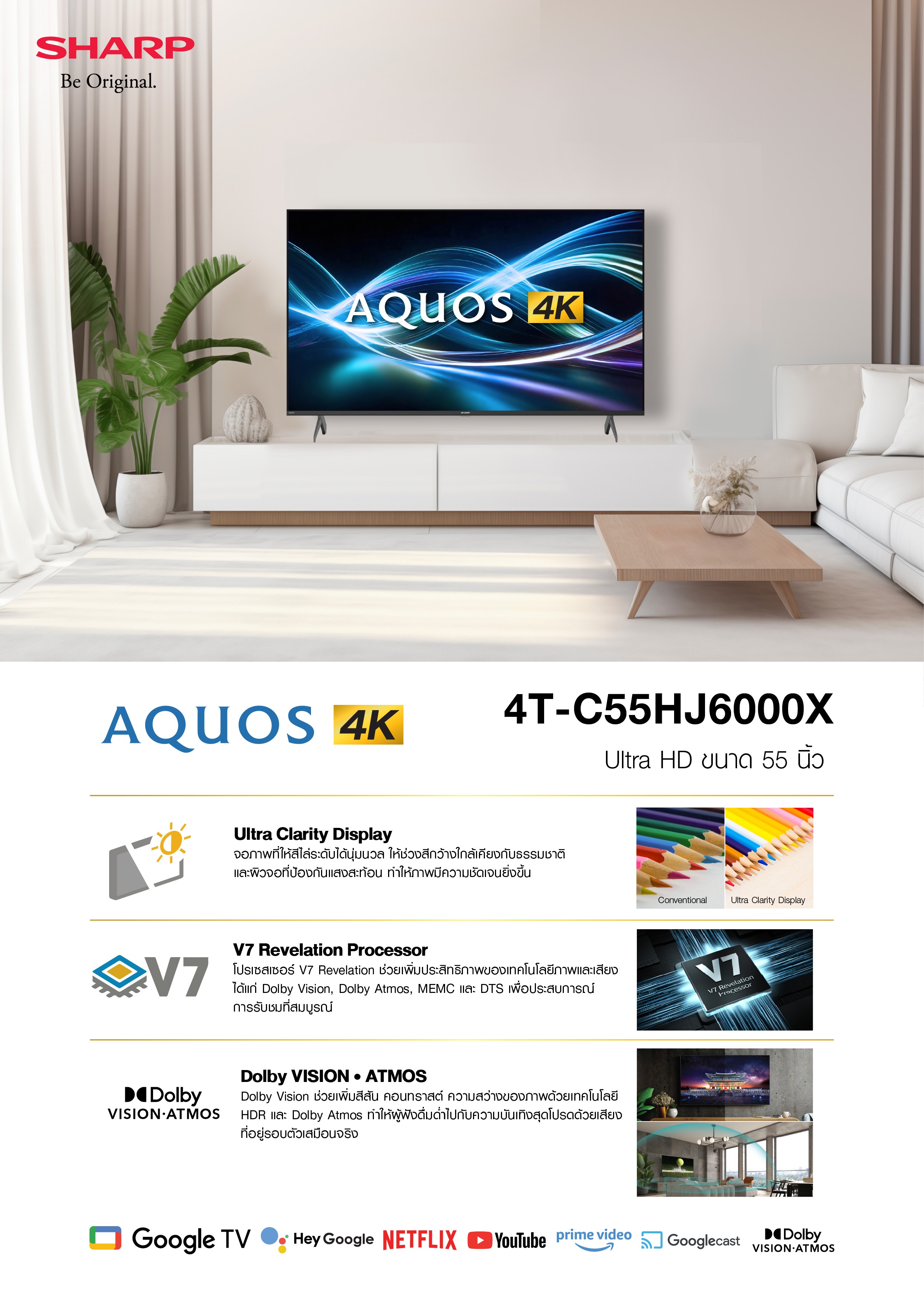 4T-C55HJ6000X เป็น Google TV ที่มาพร้อมความละเอียด 4K Ultra HD เพื่อภาพที่คมชัดและสีสันสมจริงด้วย Ultra Clarity Display, รองรับ Dolby Vision และ Dolby Atmos เพื่อประสบการณ์ภาพและเสียงที่เหนือกว่า, มีโหมดถนอมสายตา (Eye Protection Mode) และ Anti Glare เพื่อความสบายในการรับชม, รวมถึงโหมด Gaming (ALLM/VRR) สำหรับคอเกม และคุณสมบัติป้องกัน 7 ประการเพื่อความทนทาน.