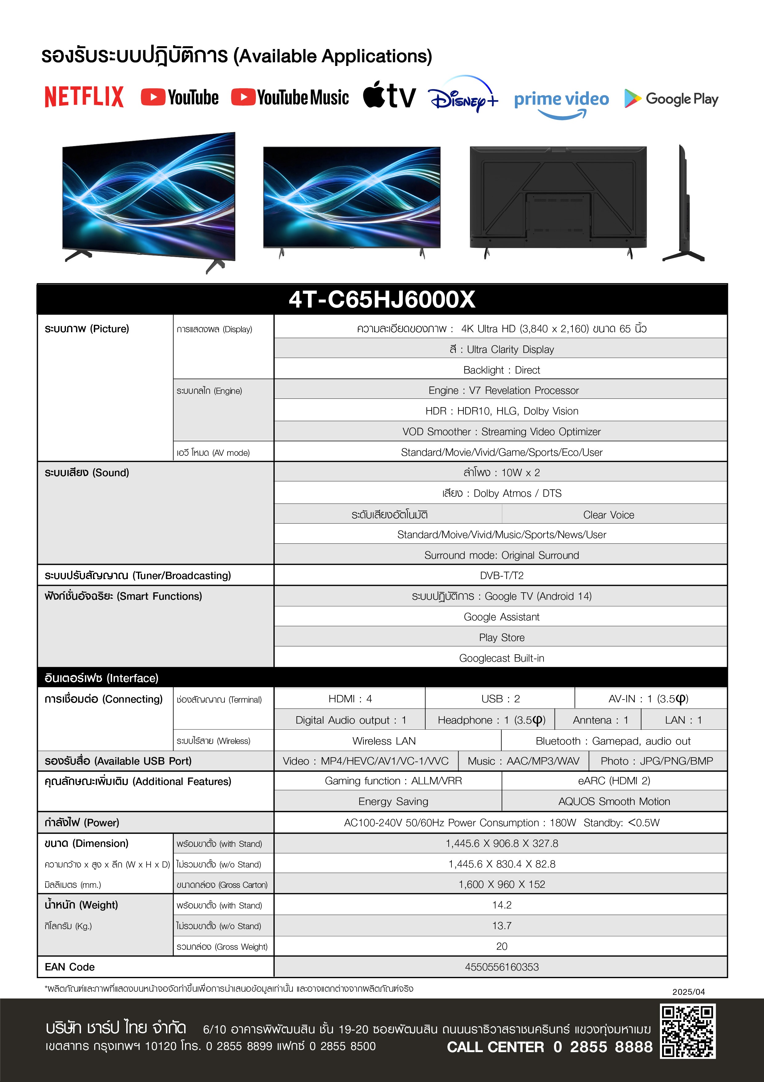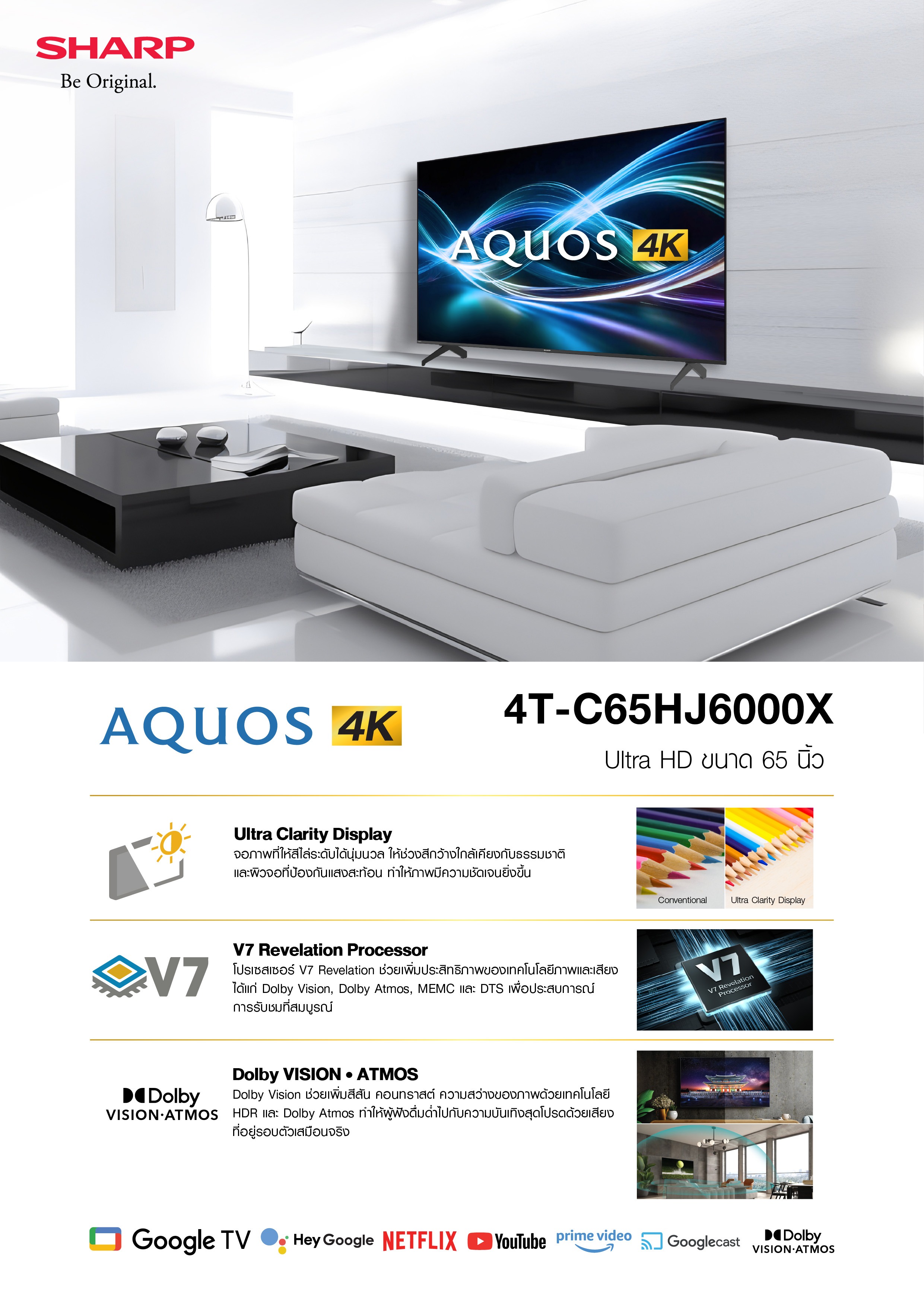 4T-C65HJ6000X เป็น Google TV ที่มาพร้อมความละเอียด 4K Ultra HD เพื่อภาพที่คมชัดและสีสันสมจริงด้วย Ultra Clarity Display, รองรับ Dolby Vision และ Dolby Atmos เพื่อประสบการณ์ภาพและเสียงที่เหนือกว่า, มีโหมดถนอมสายตา (Eye Protection Mode) และ Anti Glare เพื่อความสบายในการรับชม, รวมถึงโหมด Gaming (ALLM/VRR) สำหรับคอเกม และคุณสมบัติป้องกัน 7 ประการเพื่อความทนทาน.