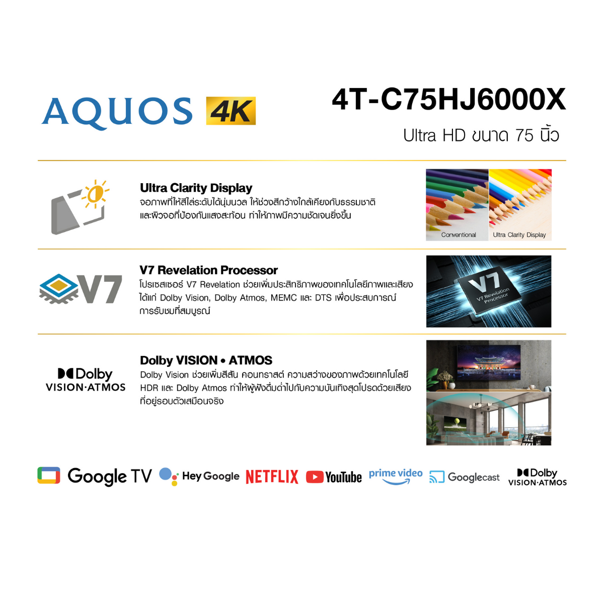 4T-C75HJ6000X เป็น Google TV ที่มาพร้อมความละเอียด 4K Ultra HD เพื่อภาพที่คมชัดและสีสันสมจริงด้วย Ultra Clarity Display, รองรับ Dolby Vision และ Dolby Atmos เพื่อประสบการณ์ภาพและเสียงที่เหนือกว่า, มีโหมดถนอมสายตา (Eye Protection Mode) และ Anti Glare เพื่อความสบายในการรับชม, รวมถึงโหมด Gaming (ALLM/VRR) สำหรับคอเกม และคุณสมบัติป้องกัน 7 ประการเพื่อความทนทาน.