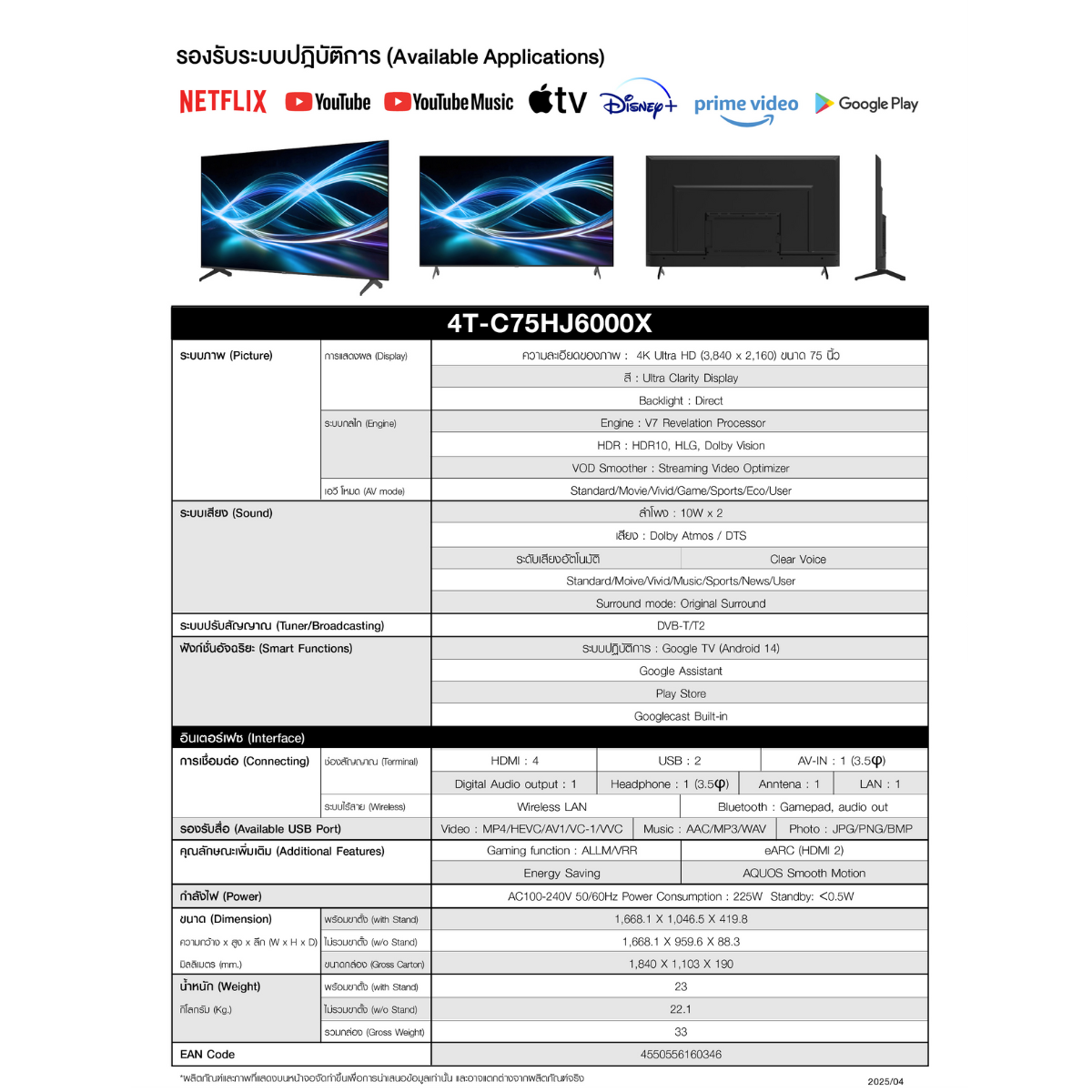 Google TV 4K Ultra HD ทีวี 75 นิ้ว SHARP รุ่น 4T-C75HJ6000X