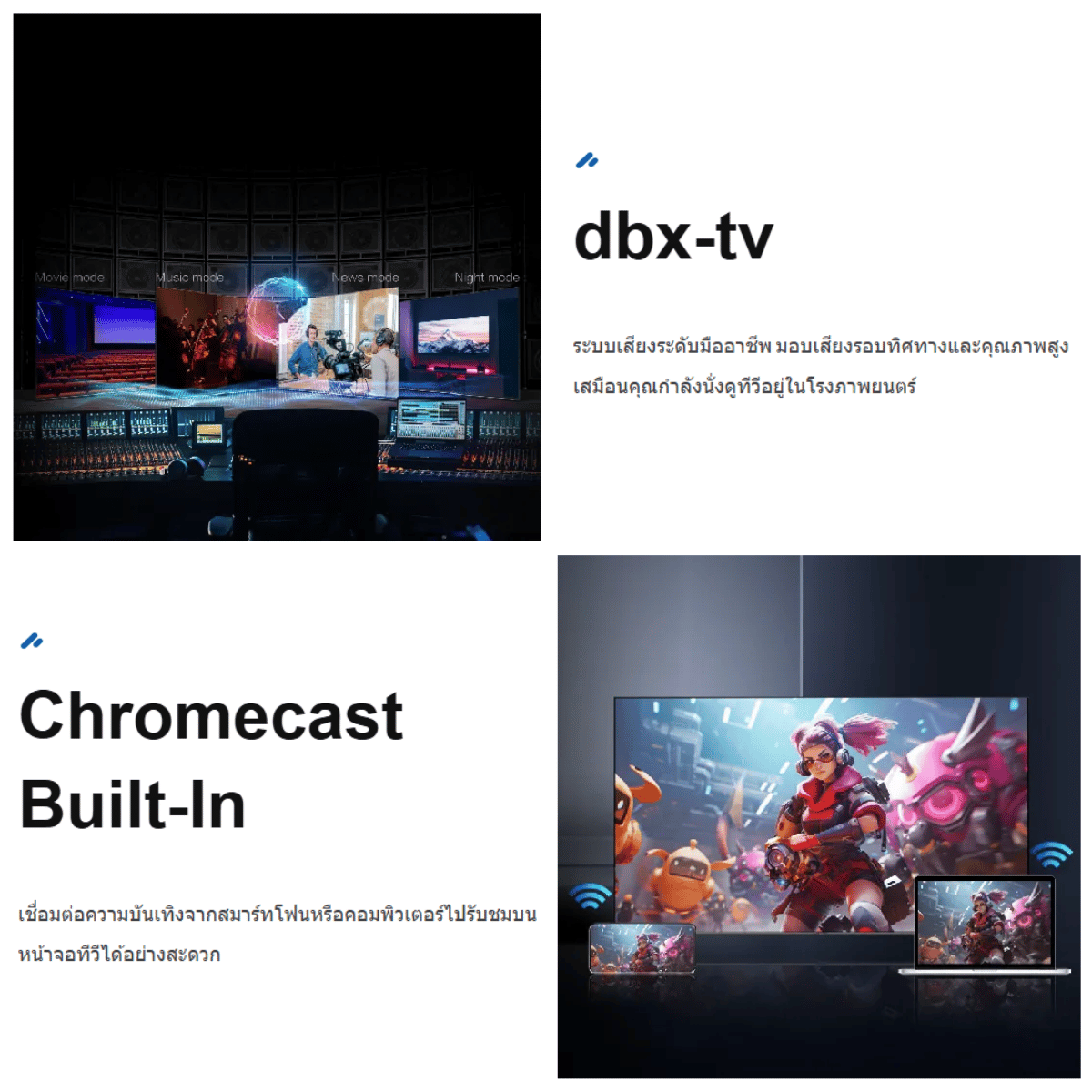 รองรับระบบเสียงที่ชัดใสและทรงพลังจาก Dolby Audio และได้รับการรับรองจาก DBX-TV