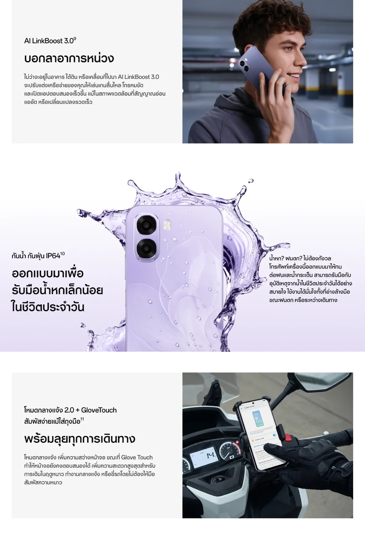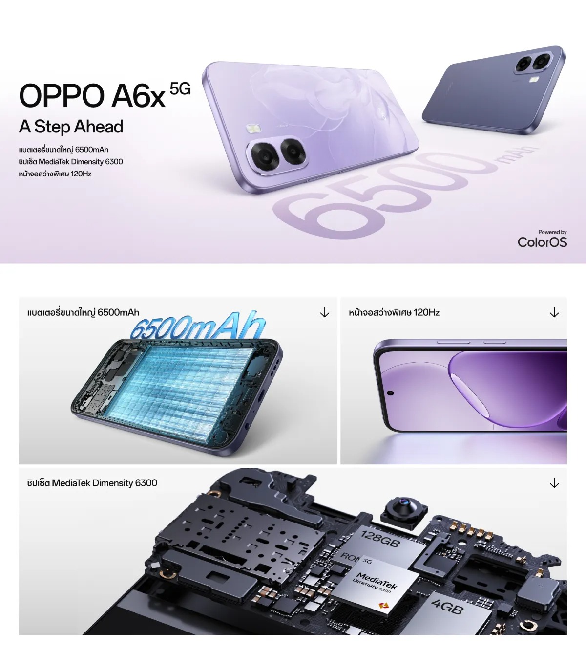 OPPO A6x 5G สมาร์ทโฟนใช้งานคุ้มค่าในราคาย่อมเยาว์ จอใหญ่ ใช้งานลื่น หน้าจอสว่างพิเศษรองรับการใช้งานประจำวันได้ดี เหมาะกับคนที่ต้องการมือถือคุ้มค่า ดูดี และกันน้ำกันฝุ่นระดับ IP64