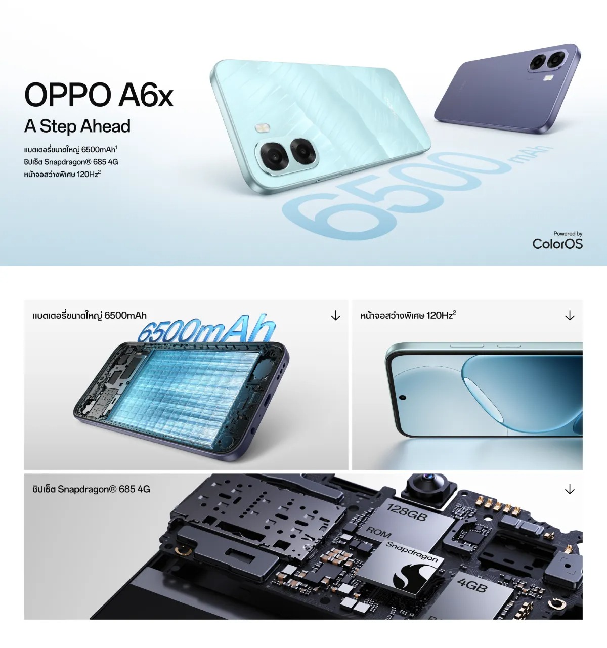 OPPO A6x สมาร์ทโฟนใช้งานคุ้มค่าในราคาย่อมเยาว์ จอใหญ่ ใช้งานลื่น หน้าจอสว่างพิเศษรองรับการใช้งานประจำวันได้ดี เหมาะกับคนที่ต้องการมือถือคุ้มค่า ดูดี และกันน้ำกันฝุ่นระดับ IP64