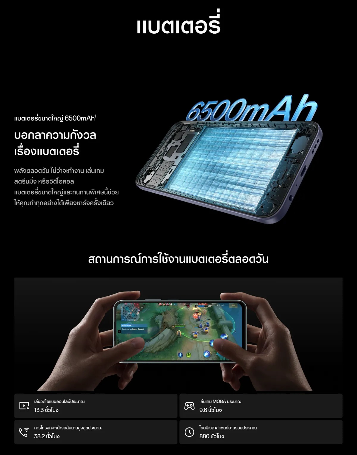 ✅แบตเตอรี่ 6,500 mAh ชาร์จเร็ว 15W